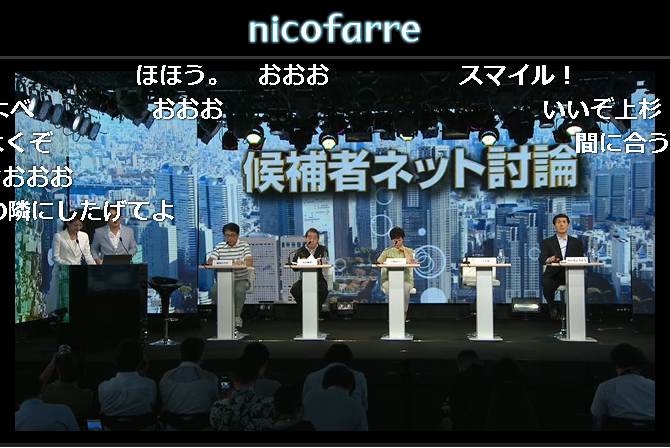 増田氏、山口氏、小池氏、上杉氏、中川氏の5名がニコニコ候補者ネット討論会を拝聴させて頂きました。